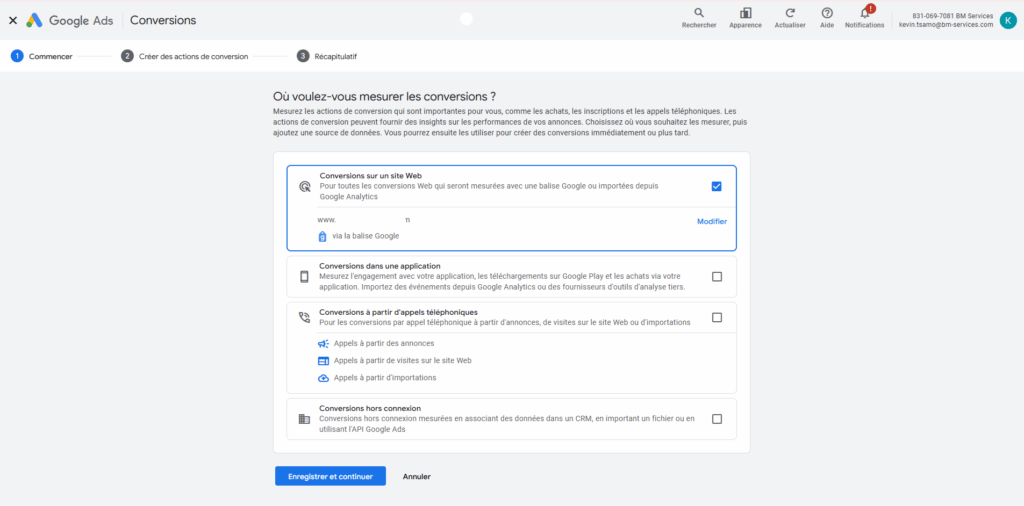 Choisissez ensuite la source de votre conversion, ça peut être depuis un site Web, une application, une annonce Google ou même hors connexion pour les données envoyées à un CRM, achat en point de vente et autres. Pour notre cas c’est « Conversion sur un site Web »